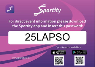 Please download the Sportity app for important event communications. You can utilize the QR code here or visit the Google Play Store or Apple AppStore for download. The event password is 25LAPSO.