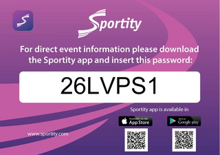Please download the Sportity app for important event communications. You can utilize the QR code here or visit the Google Play Store or Apple AppStore for download. The event password is 26LVPS1.